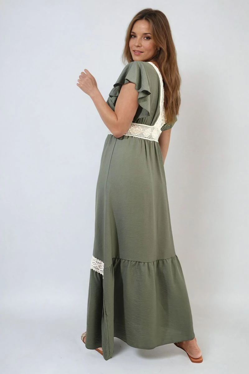 Alejandra V-neck Lace Trim Maxi Dress in Khaki Description
