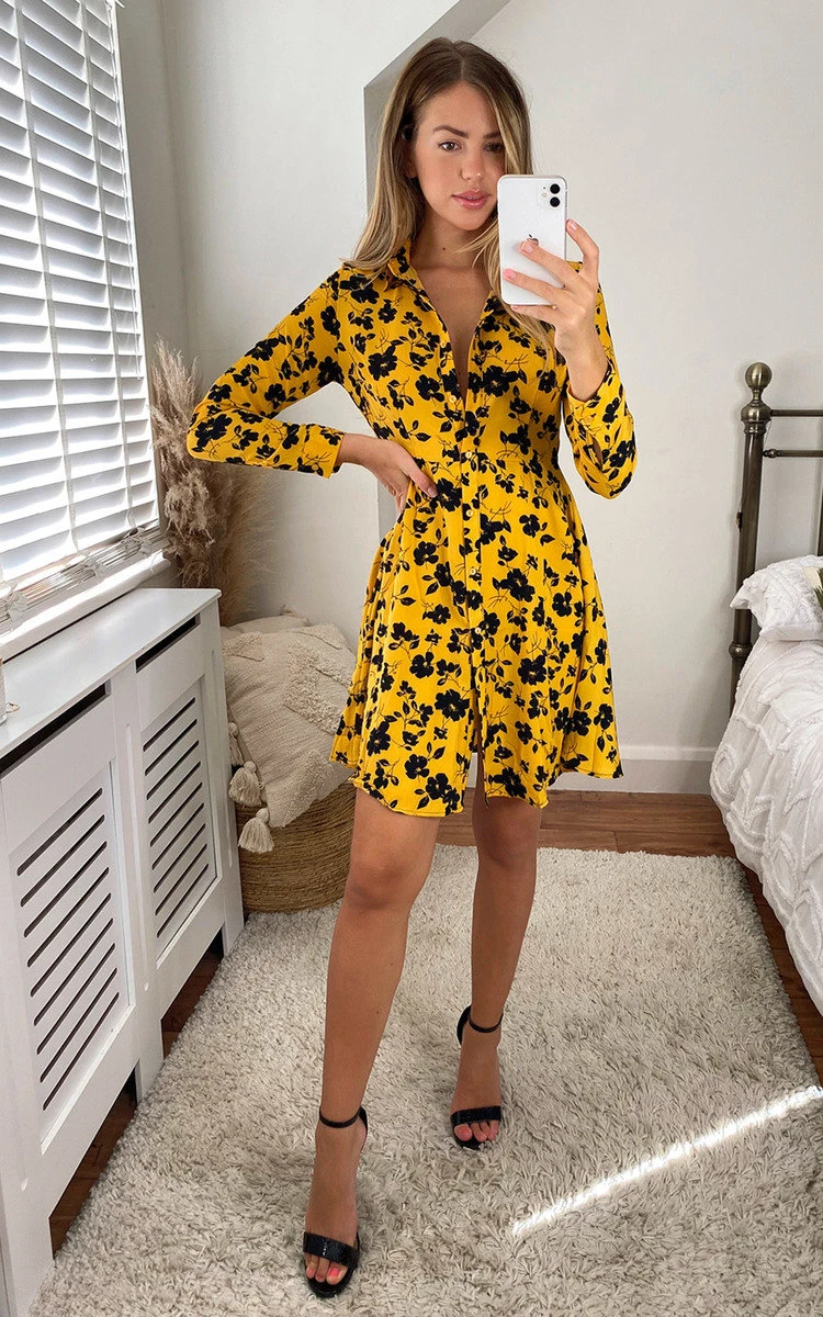 Alice Button Up Printed Shirt Dress in Mustard Description