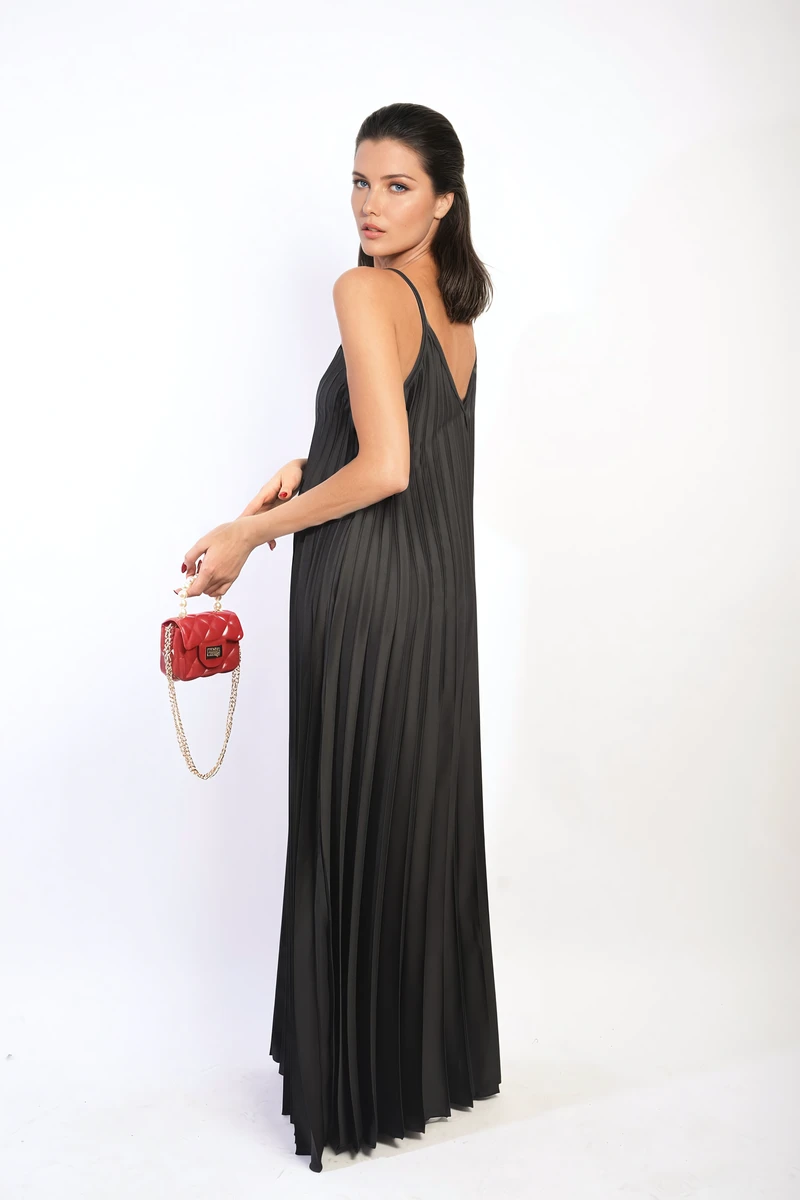 Ariana Pleated Strappy Maxi Dress in Black Description