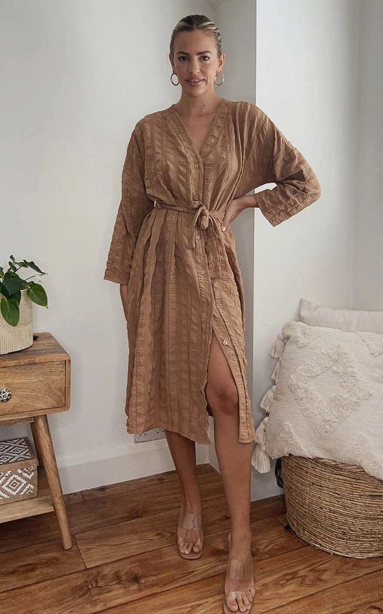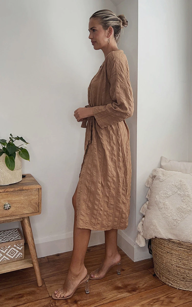 Gina Belted Wrap Front Midi Dress in Camel Description