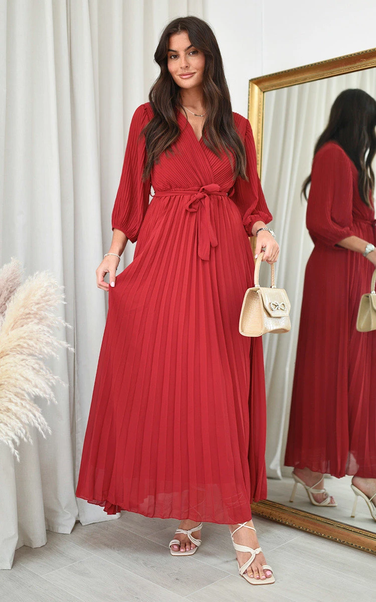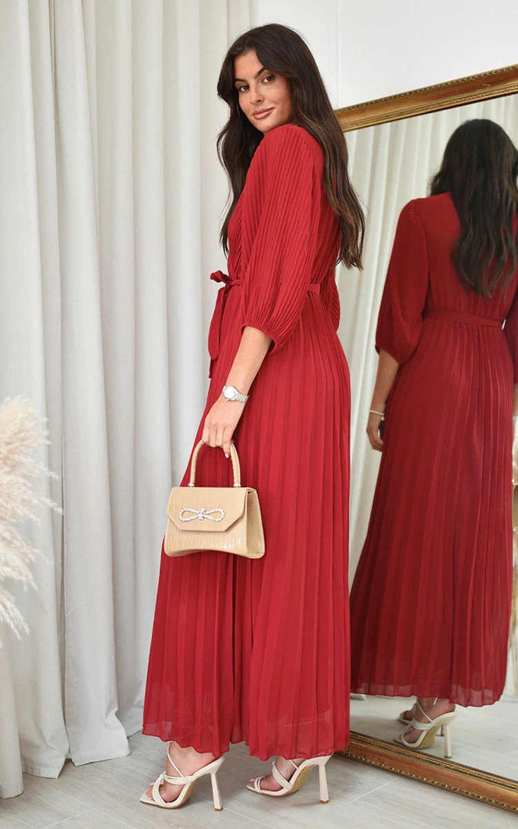 Rebeca Pleated Wrap Front Maxi Dress in Wine Description