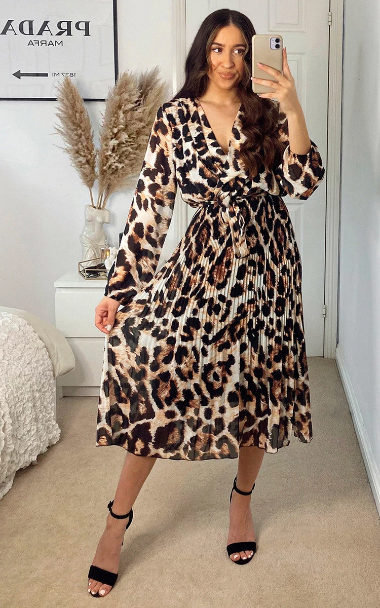 Ruby Pleated Leopard Print Maxi Dress in Leopard Description