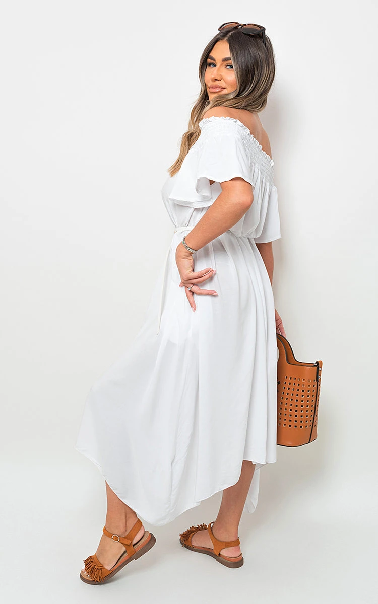 Sofia Off Shoulder Midi Summer Dress in White Description